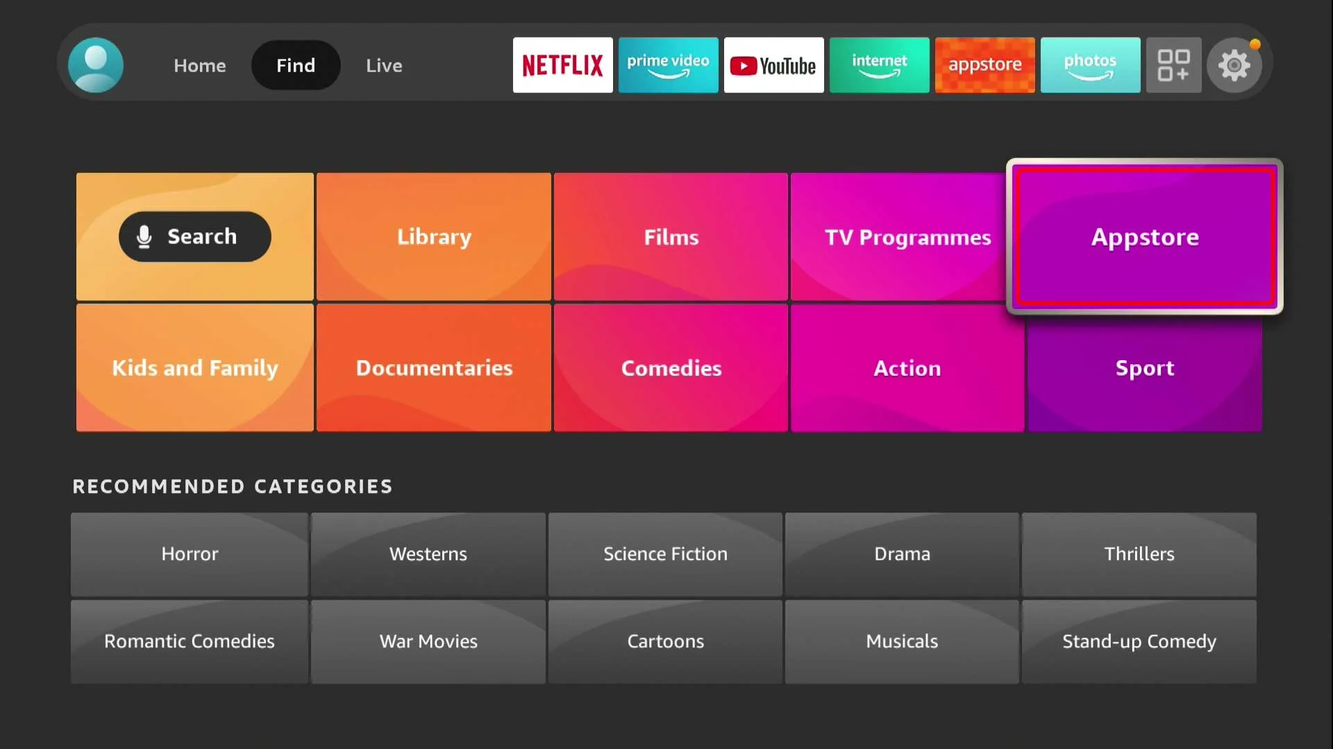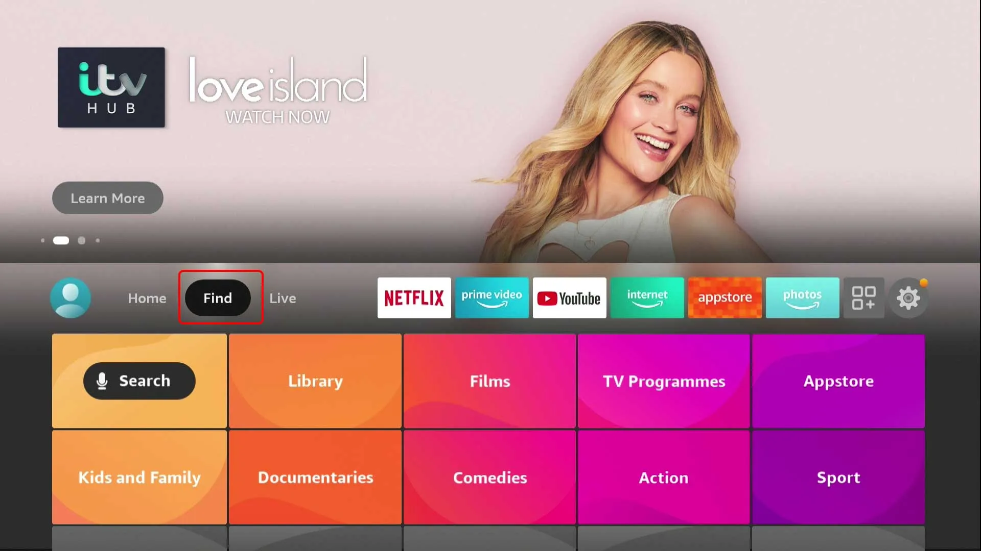 7. На пульте нажмите на кнопку “Home” (Домик) и с домашнего экрана перейдите в поиск “Find”